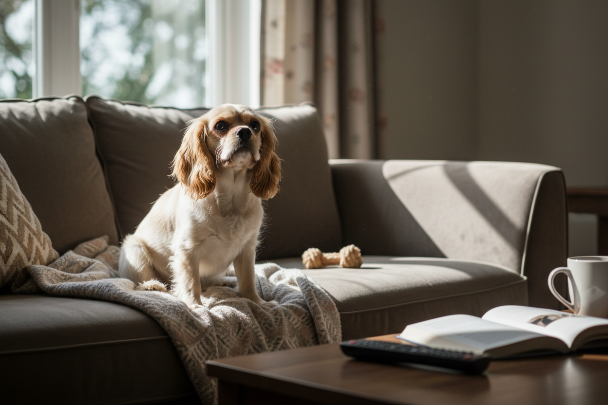 Создайте безопасное пространство. Для тревожных собак обустройте укромный уголок с любимой подстилкой и игрушками. Это место, где питомец может спрятаться во время стресса и чувствовать себя защищённым.